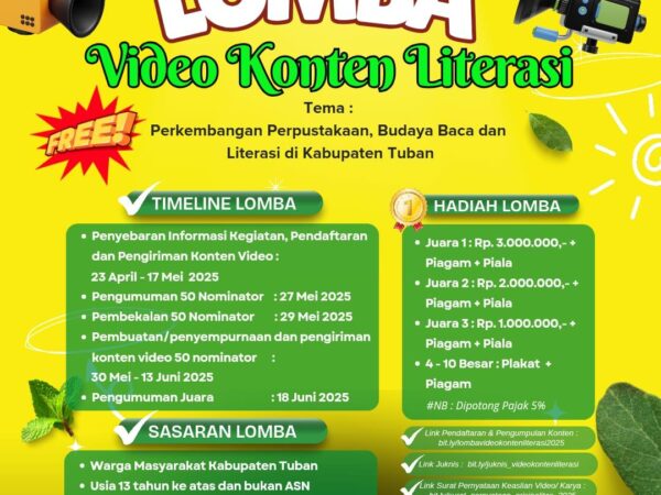 Dinas Perpustakaan dan Kearsipan Kabupaten Tuban mengadakan Lomba Video Konten Literasi 2025 dengan tema “Perkembangan Perpustakaan, Budaya Baca dan Literasi di Kabupaten Tuban” .Tunjukkan kreativitasmu dalam menyuarakan pentingnya budaya baca..